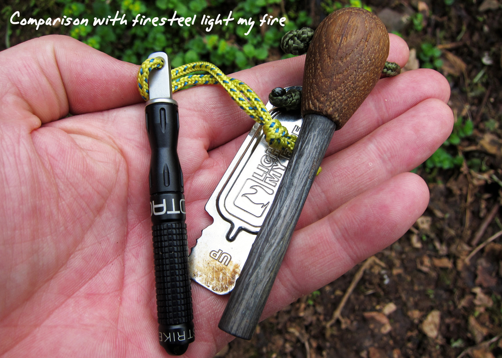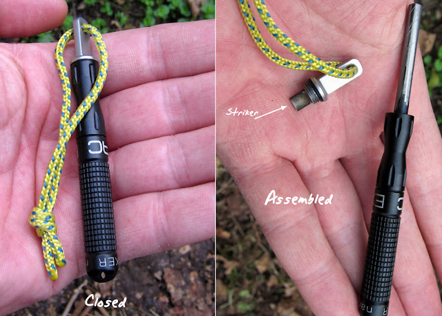 The nanostriker is a lightweight fire striker made by Exotac. It is a compact ferrocium rod that houses in a light but durable aircraft aluminium body. The rod screws into the aluminium case, complete with rubber O-ring, and is protected from both the elements and any sort of damage when stowed in a kit. At the tip of the rod’s handle, another piece unscrews to reveal a fire striker. It’s a nicely engineered and compact (i.e. a lot smaller than a typical fire steel) way to carry a rod and striker together without the bulk of a typical slat striker piece. The nanostriker features a sturdy handle of 303 stainless steel and a uniquely designed 440C stainless steel striker that is hardened to 50HRC. The striker has a shaped cross section (4 sides) to allow numerous sharp edges to ensure good sparking capability. In terms of weight the nanostriker weighs in at 17g which is a lot lighter than most firesteels. Friday, 9 April 2010